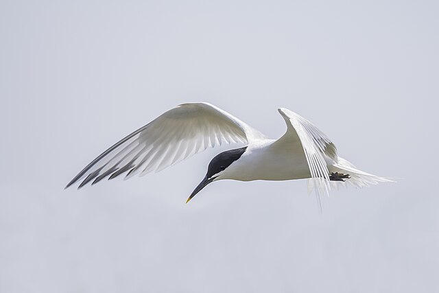 Sandwich Terns hover above the water, then plunge headfirst to catch small fish such as sand eels. Their black crest is noticeable, and the yellow-tipped black bill sets them apart from other terns. Around Lihou, you might see them passing offshore or resting on sandy areas at low tide, especially during migration seasons.